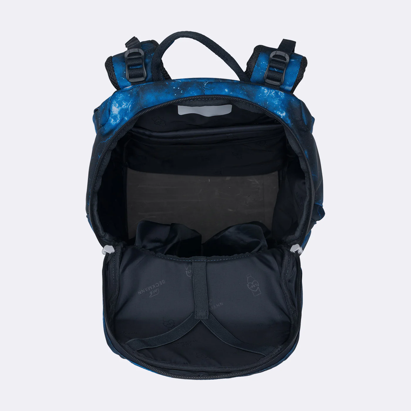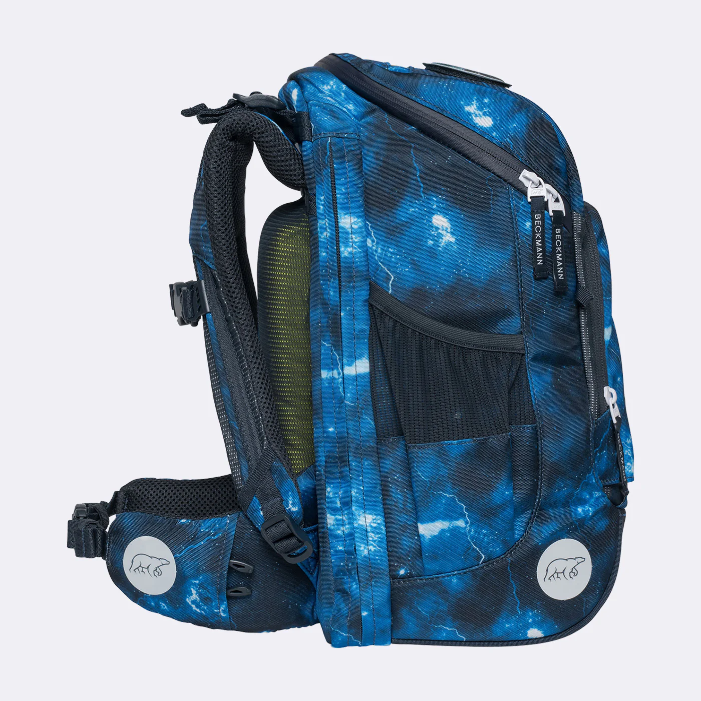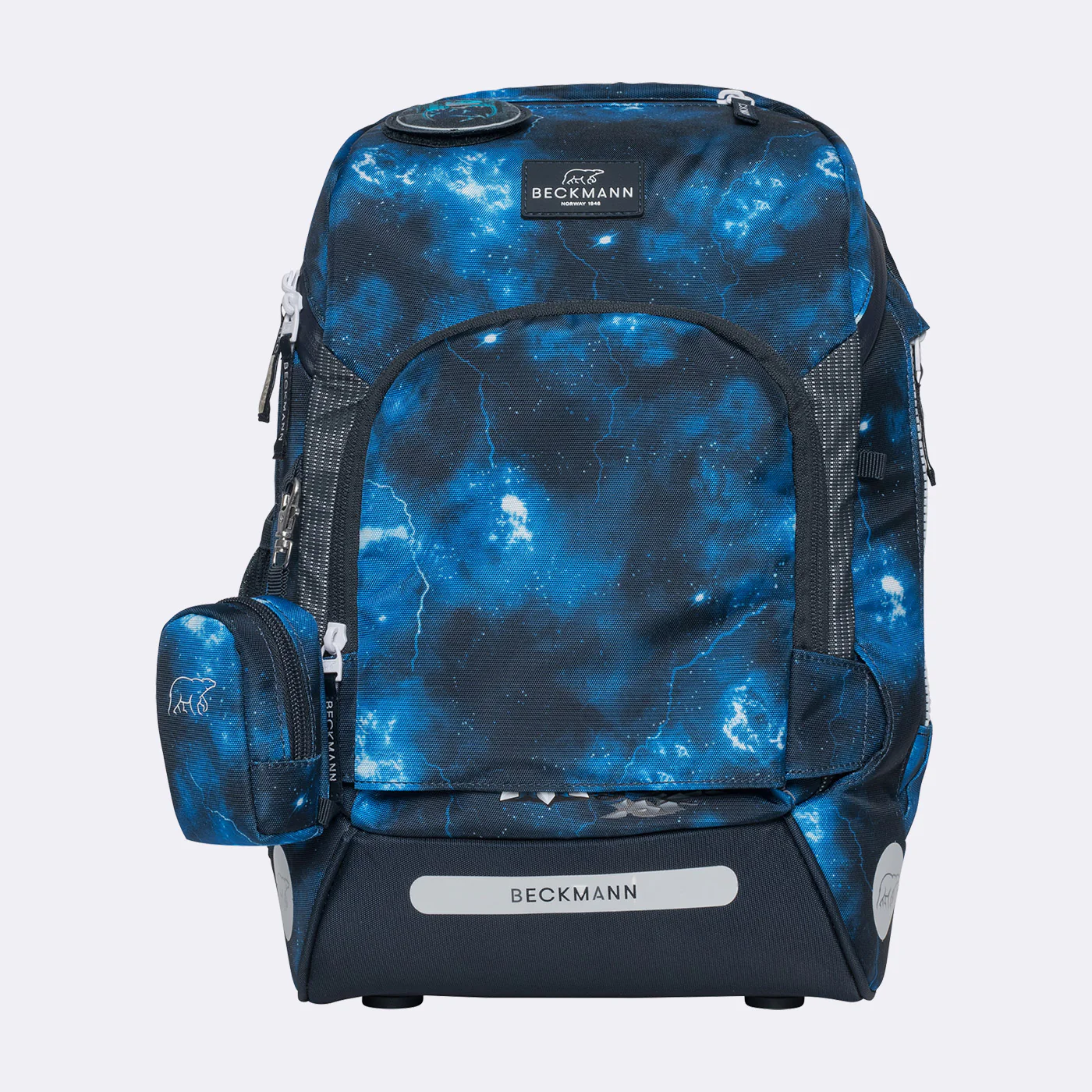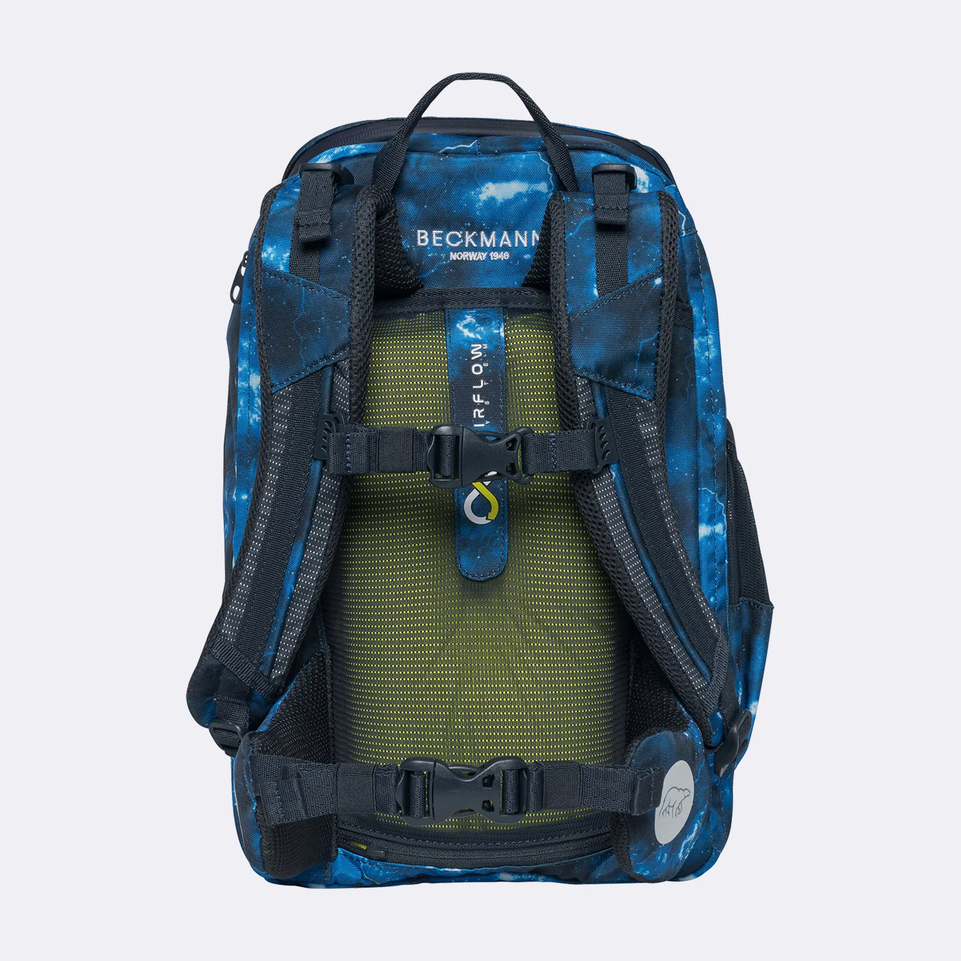 Beckmann Norway Active Air FLX 6-teiliges SetActive Air FLX mit dem preisgekrönten ‚AIR FLOW‘ Luftkissen von Beckmann! Das innovative Rückensystem basiert auf einer Kombination aus Luft und Schaumpolsterung. Der Vorteil von Luft ist, dass die Unterstützung des Rückens dynamisch erfolgt und sich ständig an deine Bewegungen anpasst. Dadurch werden die Hohlräume zwischen Rücken und Ranzen immer gefüllt, was zu noch mehr Halt und Stabilität führt.FLX – denn nicht alle Tage sind gleich! Durch das FLX-System kann das Volumen des Schulranzens bei Bedarf um ca. 5 Liter erweitert werden.Der Ranzen kommt mit einem integrierten Regenschutz in der Seitentasche, einer separaten wasserdichten Vordertasche für Brotdose und Trinkflasche und vielen verschiedenen Buttons, die an mehreren Stellen am Schulranzen befestigt werden können. Active Air FLX ist mit einer schrägen Öffnung ausgestattet, die eine gute Übersicht ermöglicht.Alle Designs haben außerdem eine wendbare Vordertasche, mit der der Ranzen sein Aussehen in Sekundenschnelle ändern kann. Kinder haben unterschiedliche Wünsche und die ändern sich im Laufe der ersten Schuljahre. Wir möchten diesen Wünschen gerecht werden. So kann der Ranzen bei Bedarf auch neutraler gestaltet werden!Gewinner des Innovationspreises für Ergonomie 2021, IGR (Institut für Gesundheit und Ergonomie)!100% des Stoffes des Active Air FLX wurde aus 43 recycelten Plastikflaschen (rPET Flaschen) hergestellt.Das Schulranzen Set besteht aus: