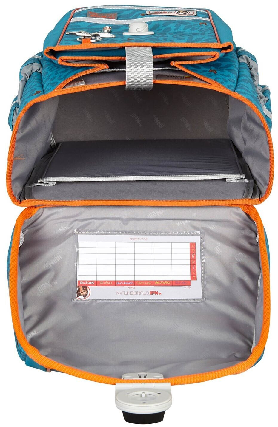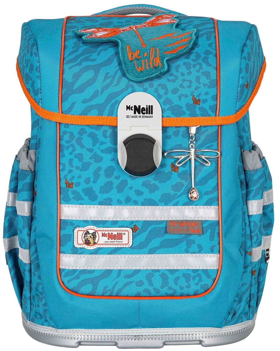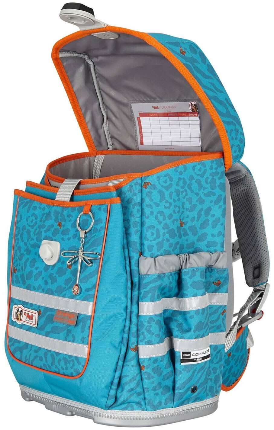 Ergo Complete – das aktuelle und kompakte Modell von McNeill zeichnet sich durch stylisches und modernes Design ausDer große Motivmagnet auf dem Überschlag ist der absolute Hingucker! Wie bei allen Modellen überzeugt Ergo Complete mit dem innovativen Smart-Flex Tragesystem. Durch das höhenverstellbare Smart-Flex Tragesystem kann der Schulranzen an den Körperbau des Kindes angepasst werden und wächst mit. Das hochwertige Rückenpolster ist ergonomisch geformt und besitzt, für ein leichtes und gutes Tragegefühl, einen Lendenwirbelschutz. Die Schultergurte sind weich gepolstert und bieten einen hohen Tragekomfort für Ihr Kind. Der höhenverstellbare Brustgurt sorgt für zusätzliche Entlastung der Schultern. Auf der Frontseite besitzt der Schulranzen ein leicht bedienbares und stylisches Magnetschloss. Die McNeill Doppelstreifen bieten zusätzliche Sicherheit in der Dunkelheit. Sie sind aus retroreflektierendem Material und werfen auftreffendes Licht zurück. So ist Ihr Kind im Straßenverkehr besser sichtbar. Vor Feuchtigkeit und Schmutz ist der McNeill Ergo Complete durch die stabile Bodenplatte geschützt. Durch die durchdachte Innenaufteilung behält Ihr Kind immer den Überblick.