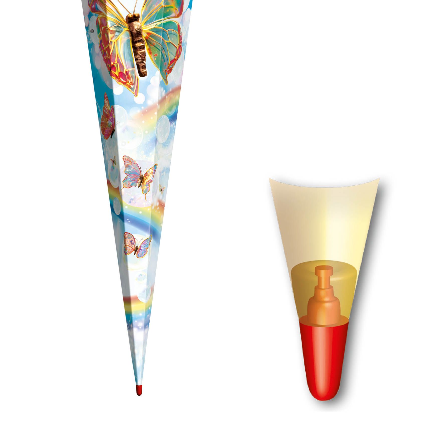 Motiv-Schultüte, Rainbow Butterfly, 85 cm, eckig, Rot(h)-Spitze, Tüllverschluss, Soundmodul, Glitzerborte