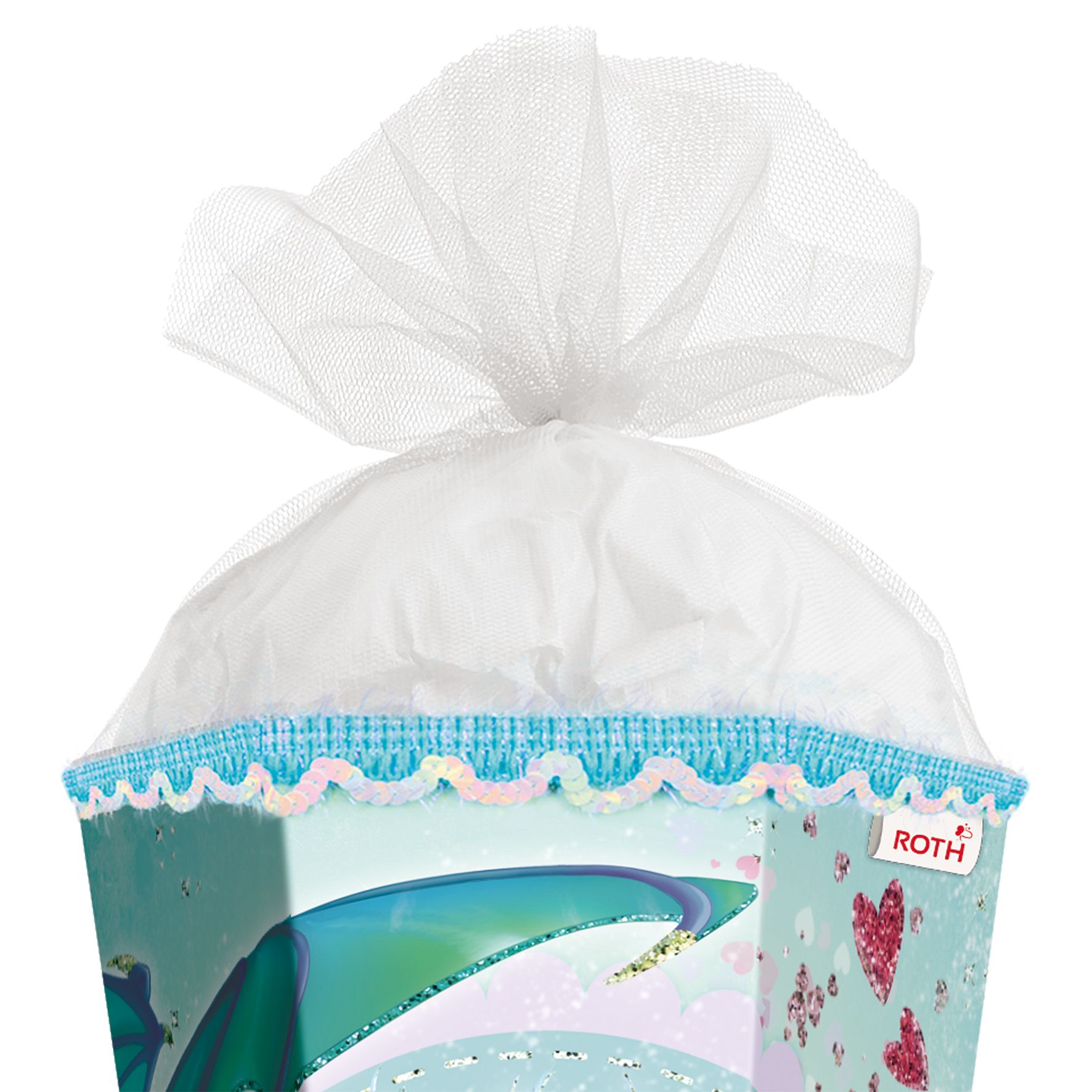• Die Motiv-Schultüte ist 85 cm groß, 6-eckig und mit weißem Tüll verschlossen