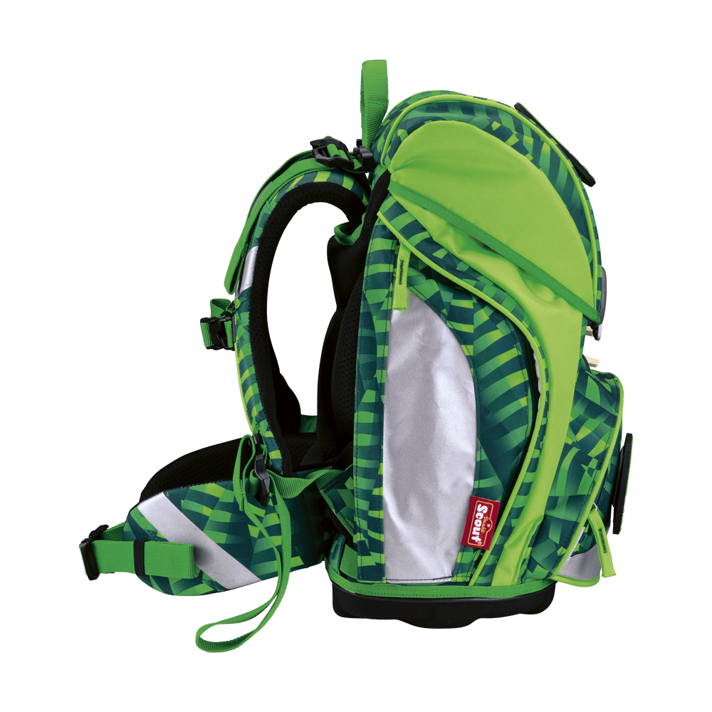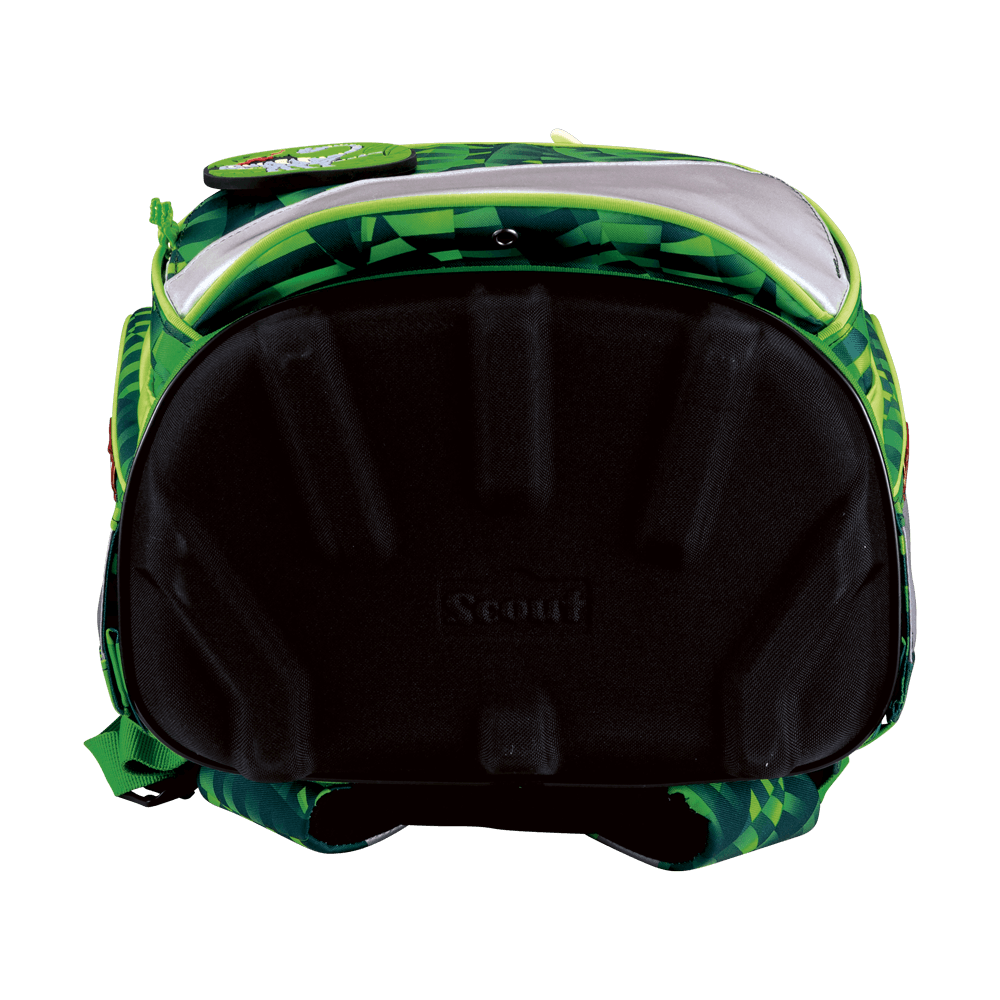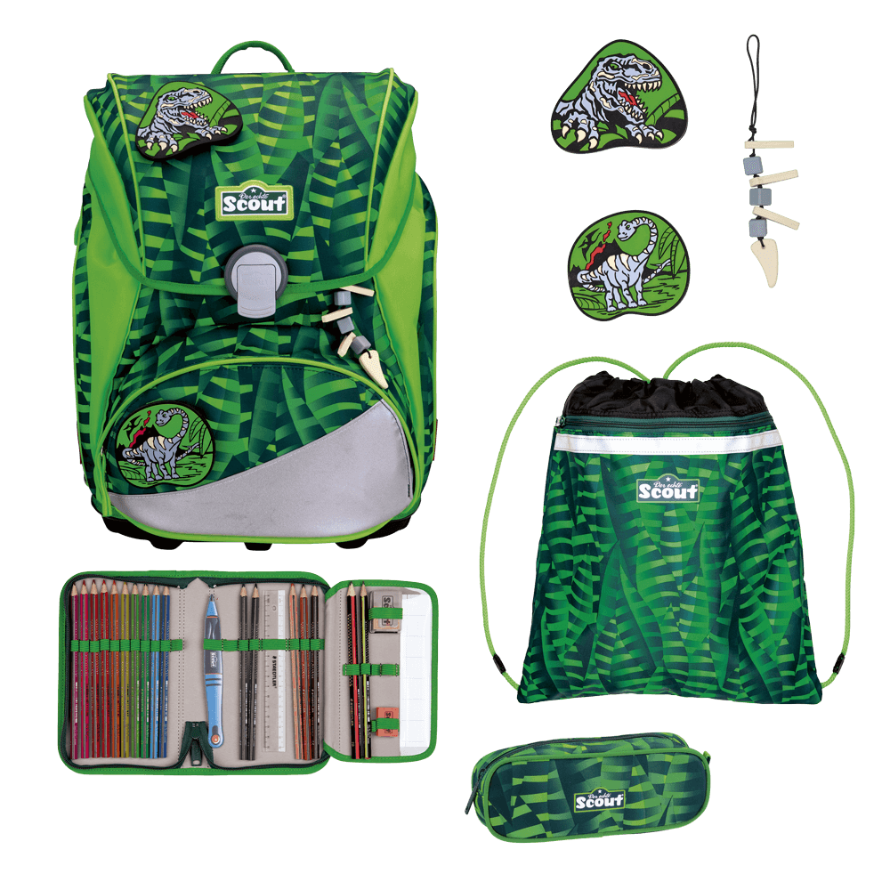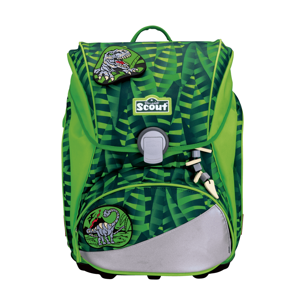 Dino-Alarm! Der geräumige Schulrucksack Scout Alpha ist bereit für ein Urzeit-Abenteuer. Er hat einen soften Korpus und sitzt ergonomisch. Mit retroreflektierenden und fluoreszierenden Flächen nach DIN 58124 ist er ganz schön auffällig. Das macht jeden kleinen Dinosaurier-Fan sichtbar. Das Beste aber: Sportbeutel, Federmäppchen mit Staedtler Qualitätsbuntstiften, Schlamperetui, 2 urzeitliche Funny Snaps Move und 1 Anhänger sind inklusive.Maße:ca. 29 x 40 x 24 cm