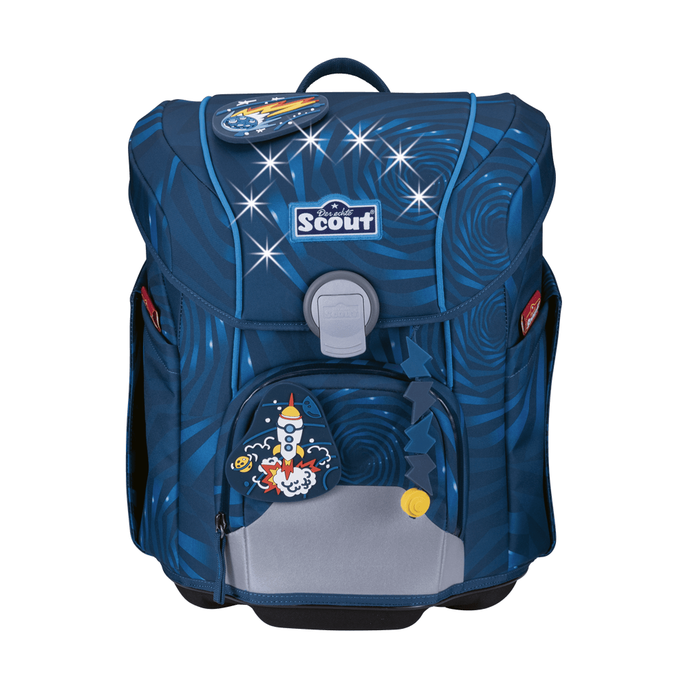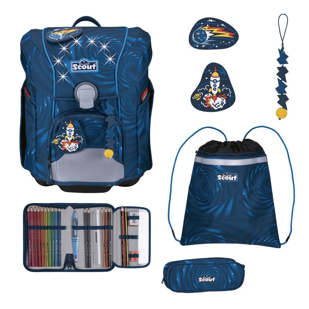 Raketen-Start in die Schule: mit unserem leichten Schulranzen Scout Micro Exklusiv LED Rocket Rider. Dank der sieben blinkenden Lichter und der retroreflektierenden Flächen leuchtet der Ranzen extra hell. Zudem sitzt er ergonomisch, hat einen festen Korpus und ist mit seiner abgerundeten Form und abgeschrägtem Deckel ideal für kleine, zierliche Kinder. Das Beste aber: Sportbeutel, Federmäppchen mit Staedtler Qualitätsbuntstiften, Schlamperetui, 2 coole Funny Snaps Move und 1 Anhänger sowie 2 AA Batterien sind inklusive.Maße:ca. 30 x 37 x 24 cm