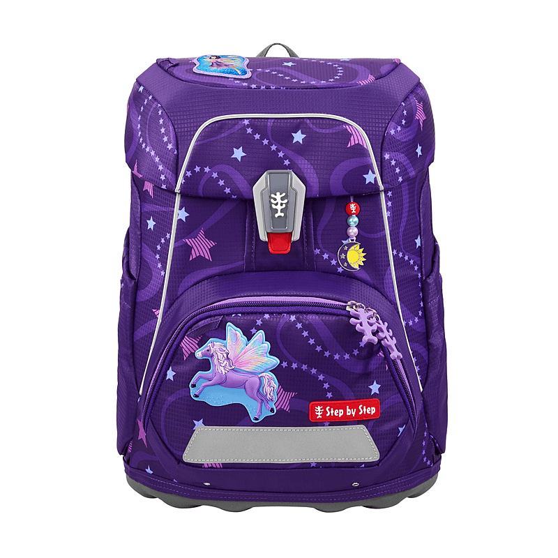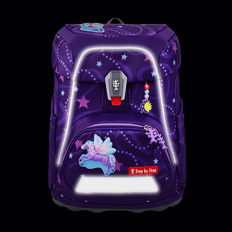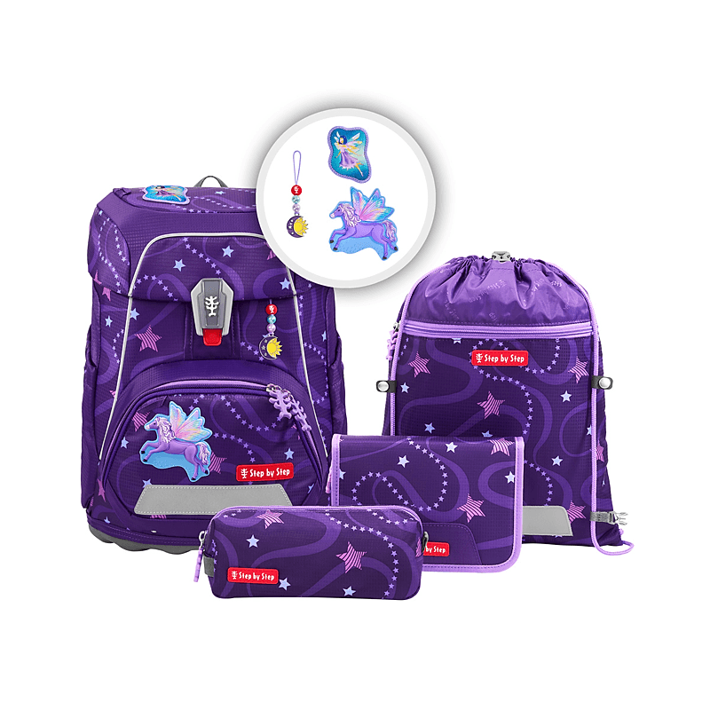 FITDer schmale Schulranzen 5-teiliges Set, bestehend aus Schulranzen, Federmäppchen (komplett bestückt), Schlamperetui, Sportbeutel und MAGIC MAGSSchmal geschnitten, groß in Funktion – der schlanke Begleiter für kleine SchulternSchmale Schulranzen bieten für zierliche Kinder gleich mehrere Vorteile: Sie sind leichter und passen sich besser an die schmalen Schultern an, wodurch das Gewicht ergonomisch verteilt wird. Trotz der schlanken Form des FIT fasst er 19 Liter und ist somit der perfekte Begleiter von der 1. bis zur 4. Klasse. Dies wird durch das EASY GROW SYSTEM gewährleistet, durch welches der Schulranzen höhenverstellbar wird und sich an die jeweilige Größe Deines Kindes anpassen lässt. Die wechselbaren Motive sorgen dafür, dass der Schulranzen Deinem Kind über die gesamte Grundschulzeit hinweg gefällt.Der Fit zeichnet sich aus durch seine praktische rucksackähnliche Form mit dem geringen Gewicht von gerade mal 900 g. Durch seinen schlanken Schnitt ist der Schulranzen ideal für kleine und zierliche Kinder und somit perfekt für kleine Schultern. Durch seine 19 Liter Volumen passen Schulbücher, Brotdose und Trinkflasche(n)  perfekt in das Hauptfach, die Seitentaschen ( mit Auslaufösen ) und die Fronttasche ( mit Auslaufösen ).Mit dem  Easy-Grow-System lässt sich die Höhe der Schultergurte sowie die Rückenlänge des Schulranzens perfekt auf die Länge des Kinderrückens einstellen – von 100 cm bis 150 cm Körpergröße.Die in der Länge justierbaren und gepolsterten Schultergurte sorgen für eine kompfortable und richtige Position des Schulranzens.Durch den höhenverstellbaren Brustgurt und den Hüftgurt ( abnehmbar und mit zusätzlichen kleinen Reißverschlussfach ), wird das Gewicht des Schulranzens und dessen Inhalt gleichmäßig auf den ganzen Körper verteilt.Das ergonomisch vorgeformte Rückenpolster aus atmungsaktiven Material ermöglicht einen bequemen Sitz, ohne dabei zu schwitzen und entlastet den Körper in jeder Wachstumsphase.Reflektierende Elemente befinden sich über den ganzen Ranzen verteilt und sorgen für bessere Sichtbarkeit im Dunkeln.Die Magic Mags machen den Schulranzen bunt und individuell. Die wechselbaren Motive und Anhänger lassen sich schnell und einfach austauschen.Der Step by Step Fit besitzt zusätzliche Schlaufen wo sich die Happy Charms oder ander Anhänger befestigen lasssen.Ein intergriertes und unauffälliges Fach in der Seitentasche bietet Platz für einen AIRTAG für mehr Sicherheit und eine gutes Gefühl im Alltag.Lieferumfang1 Schulranzen 1 Federmäppchen, komplett bestückt mit Markenstiften 7 Jumbo-Markenstifte 12 Farb-Markenstifte 1 Bleistift 1 Step by Step Lineal 1 Step by Step Geodreieck 1 Step by Step Doppelspitzer 1 Radiergummi 1 Schlampermäppchen 1 Turnbeutel 1 Set MAGIC MAGS (2 Applikationen und 1 Anhänger)ProduktdetailsEmpfohlene Anwendung:   Grundschule Kollektion:                     2026Technische DetailsFächeranzahl:                   5 Pflegehinweise:Nur feuchter Lappen, keine Reinigungsmittel Schmutzige Stellen mit einem feuchten Tuch reinigen Direkte Wasserreinigung vermeiden, nicht Wasch-/Spülmaschinen geeignet.Gewicht Schulranzenkorpus:                                      990 g Gewicht Schulranzen mit abnehmbaren Elementen:          1750 gMaterialeigenschaften   WasserabweisendMaterial:                                                       Polyester Größe (BxHxT):                                          28 cm x 37.5 cm x 20 cmVolumen Seitentaschen:                                  2 l Volumen Fronttasche:                                            1.5 l Sicherheit:                                                     Reflektierende Flächen
